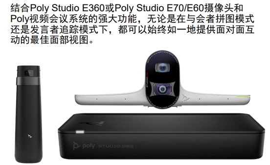 •永远展现你最好的一面 结合Poly Studio E360或Poly Studio E70/E60摄像头和 Poly视频会议系统的强大功能,无论是在与会者拼图模式 还是发言者追踪模式下,都可以始终如一地提供面对面互 动的最佳面部视图。